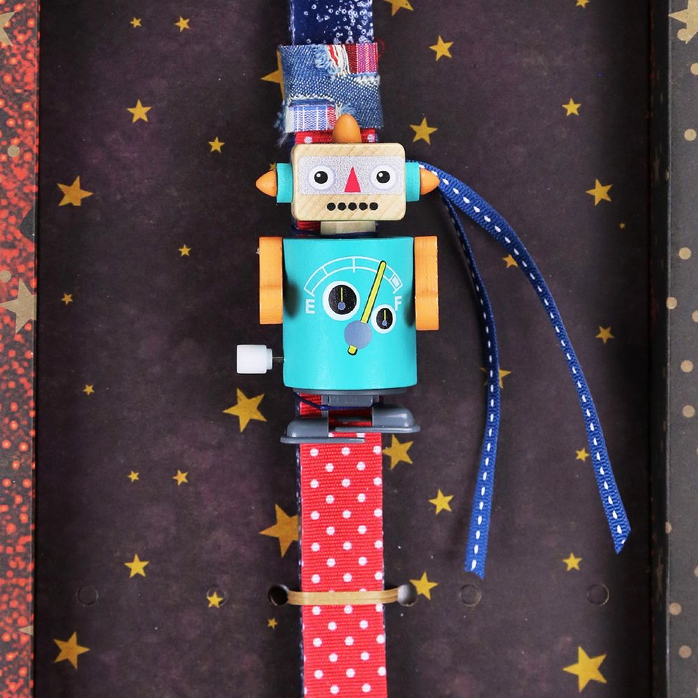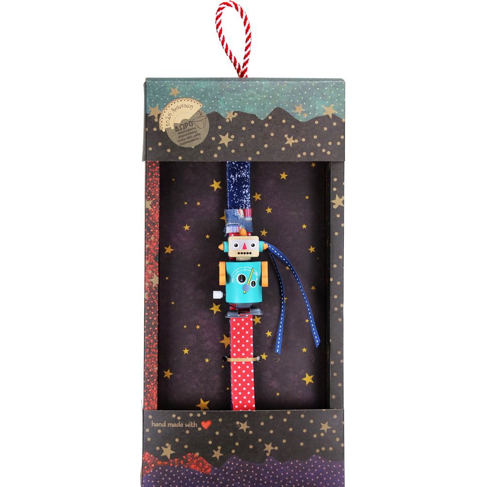 Μια πασχαλινή λαμπάδα που φέρνει τη μαγεία των vintage παιχνιδιών στο σήμερα. Το ξύλινο κουρδιστό ρομποτάκι κινείται και περπατά, χαρίζοντας χαμόγελα και ενθουσιασμό. Ιδανική για μικρά αγόρια, βαφτιστήρια και παιδιά που αγαπούν τα ρετρό παιχνίδια με χαρακτήρα.