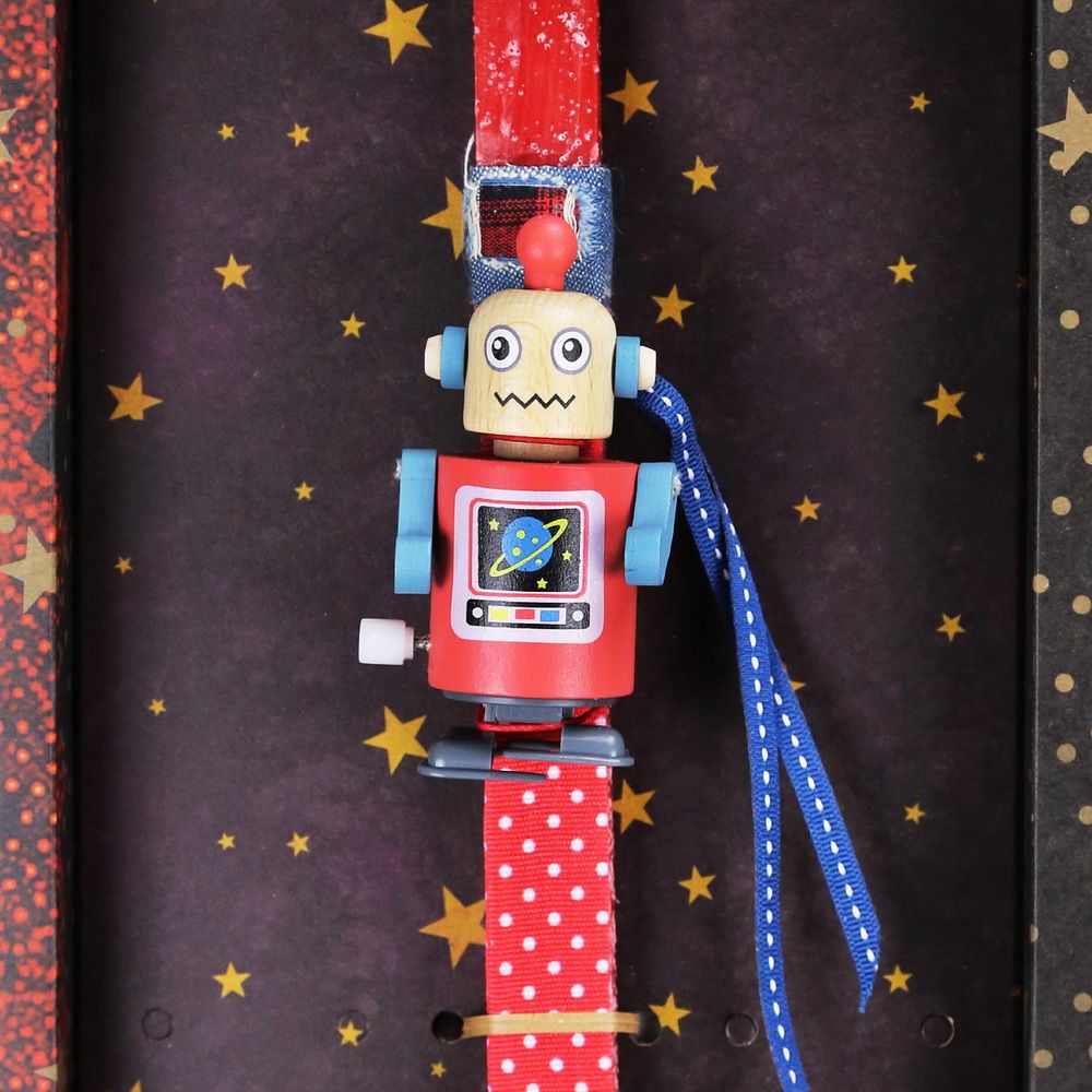 Μια πασχαλινή λαμπάδα που φέρνει τη μαγεία των vintage παιχνιδιών στο σήμερα. Το ξύλινο κουρδιστό ρομποτάκι κινείται και περπατά, χαρίζοντας χαμόγελα και ενθουσιασμό. Ιδανική για μικρά αγόρια, βαφτιστήρια και παιδιά που αγαπούν τα ρετρό παιχνίδια με χαρακτήρα.