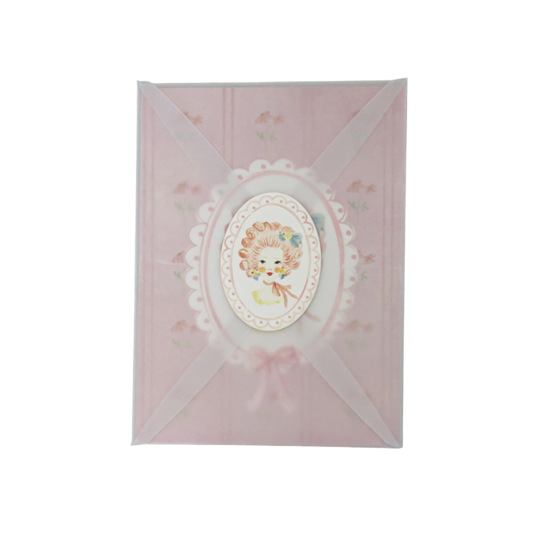 Vintage προσκλητήριο βάπτισης κοριτσιού με κυρία εποχής, λουλούδια και σκυλάκι. Κομψά scalloped περιθώρια σε ροζ και ιβουάρ αποχρώσεις.