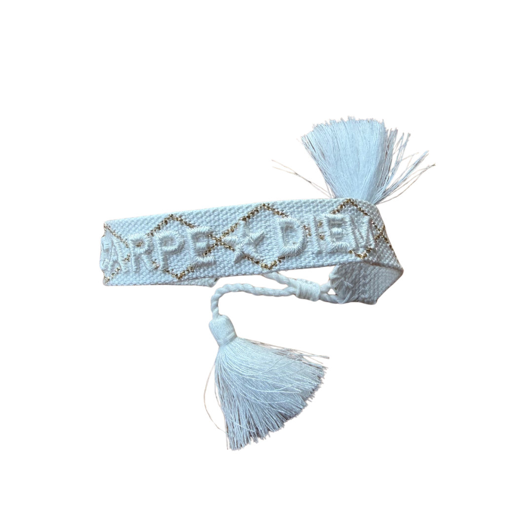 Χειροποίητο υφαντό βραχιόλι με κέντημα CARPE DIEM. Χρώματα: offwhite & gold.