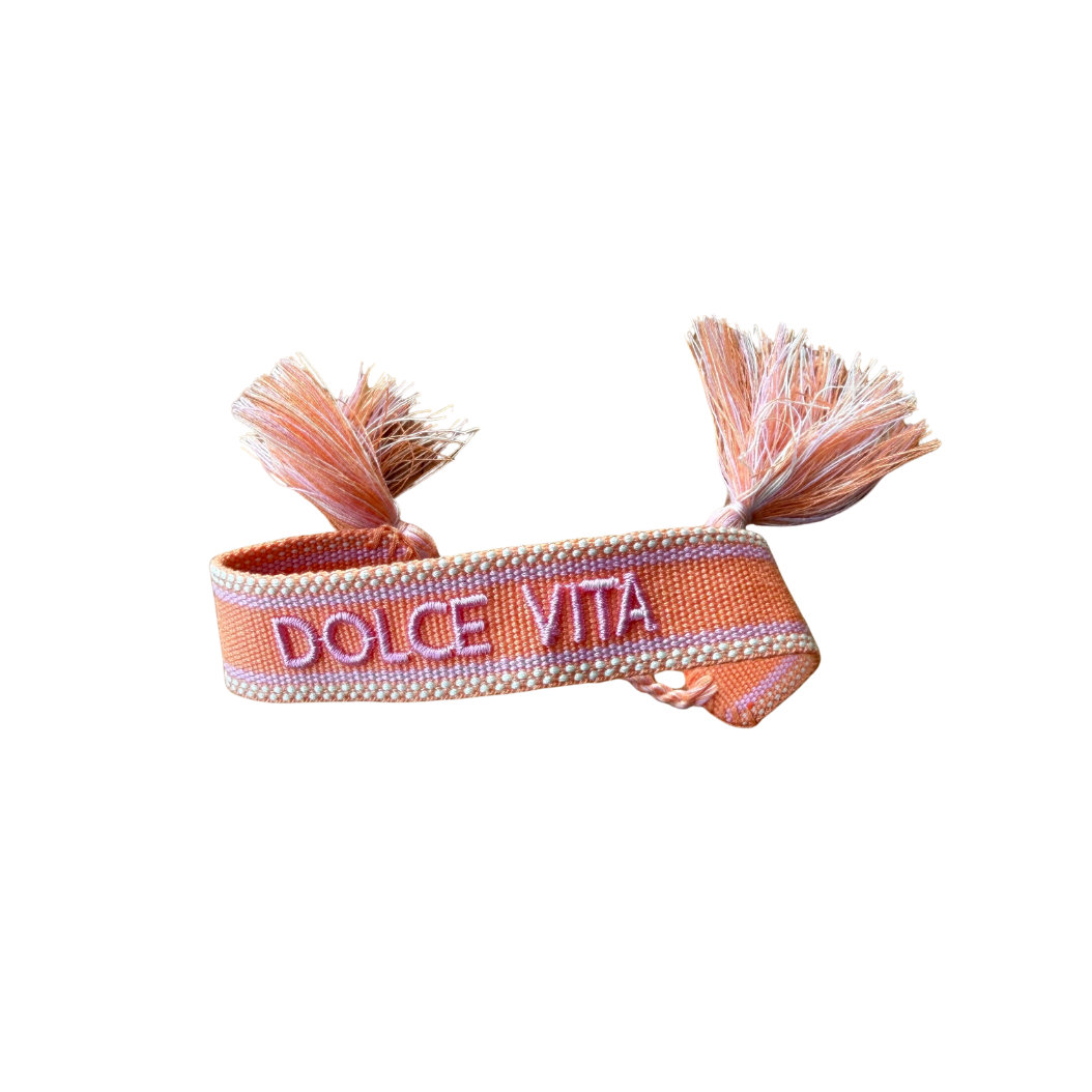Μια υπενθύμιση που φοράς στον καρπό σου. Το βραχιόλι DOLCE VITA είναι χειροποίητο, υφαντό και κεντητό, φτιαγμένο για να το φοράς κάθε μέρα και να το βλέπουν όλοι. Ιδανικό δώρο για κάποια που ξέρει να χαίρεται τη ζωή ή για τον εαυτό σου.